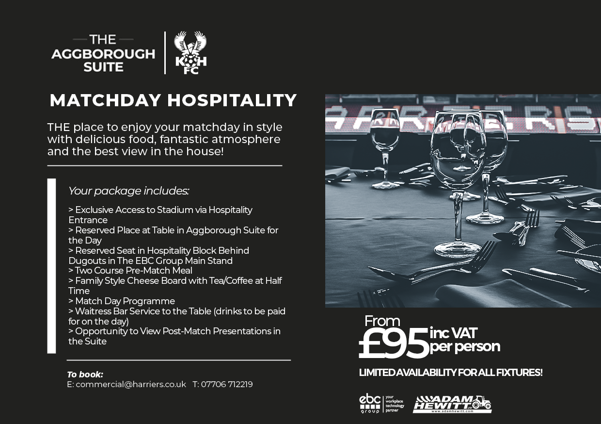 For the full range of packages including Match Sponsorships, just get in touch with us by calling 07706 712219 and speaking to Paul Biggerstaff, or e-mailing commercial@harriers.co.uk.