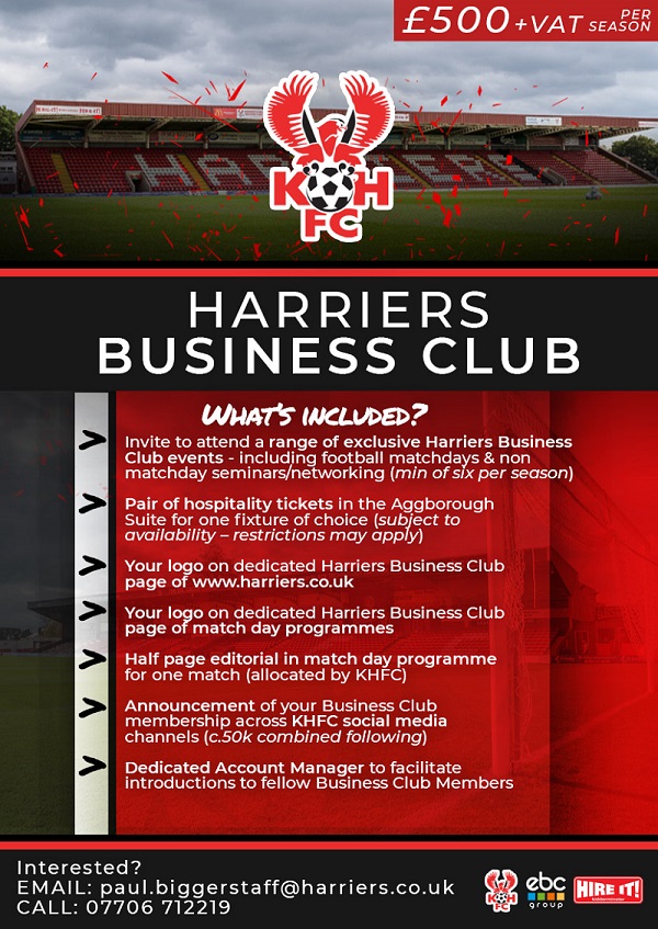 Harriers Commercial Manager, Paul Biggerstaff, said “The club already engages with a vast number of businesses in many different ways, but the Harriers Business Club will provide a platform from which they can engage better with each other.