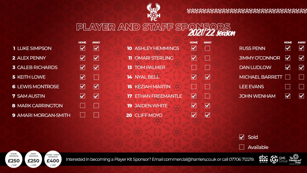 Home & Away Sponsorship is still available for the likes of new signing Mark Carrington and Amari-Morgan Smith, with Away Sponsorship available for, amongst others, Ashley Hemmings, Omari Sterling and Keith Lowe.