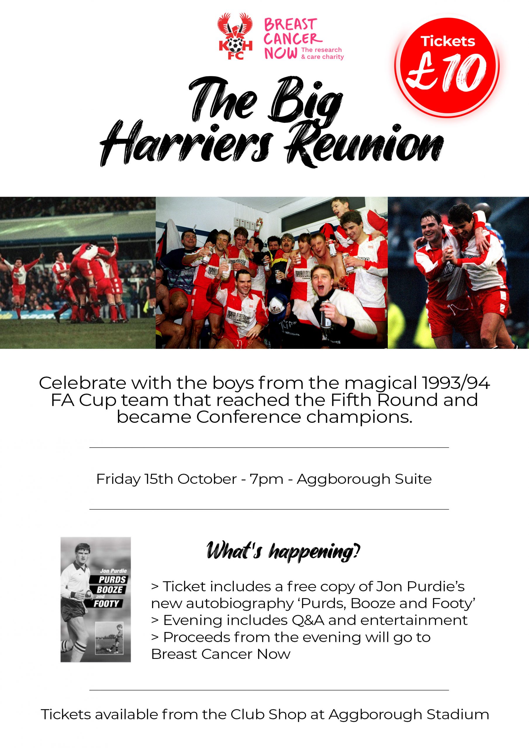 Costing £10 and available from the Club Shop at Aggborough Stadium or by calling 01562 823931, your ticket will include a free copy of Purdie’s autobiography, ‘Purds, Booze and Footy’, and proceeds will go to Breast Cancer Now.