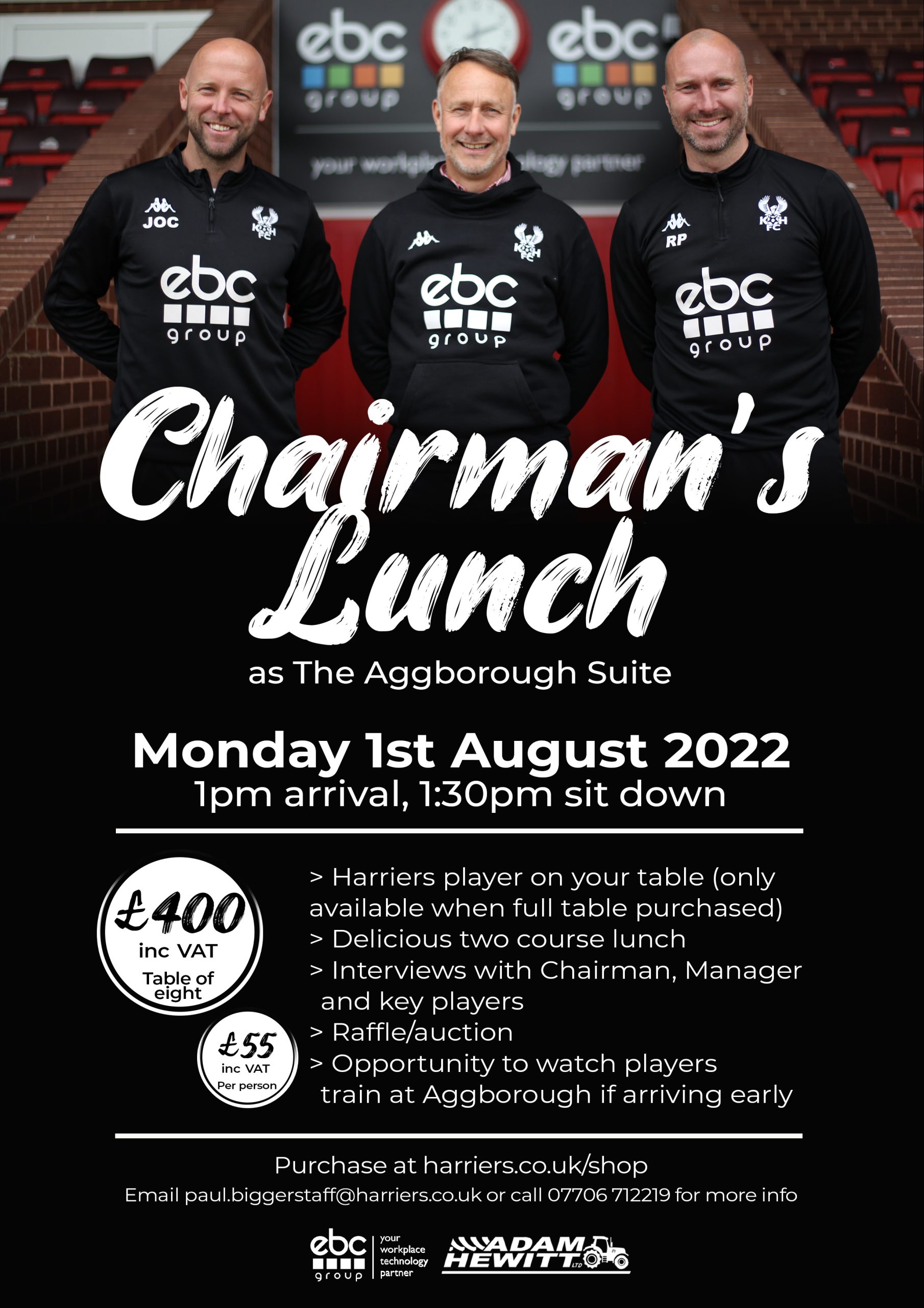 Join us for our inaugural Chairman’s Lunch as Richard Lane is joined by the full Harriers squad and an Aggborough Suite full of guests for a sumptuous two course lunch and a look ahead to the 2022/23 season.