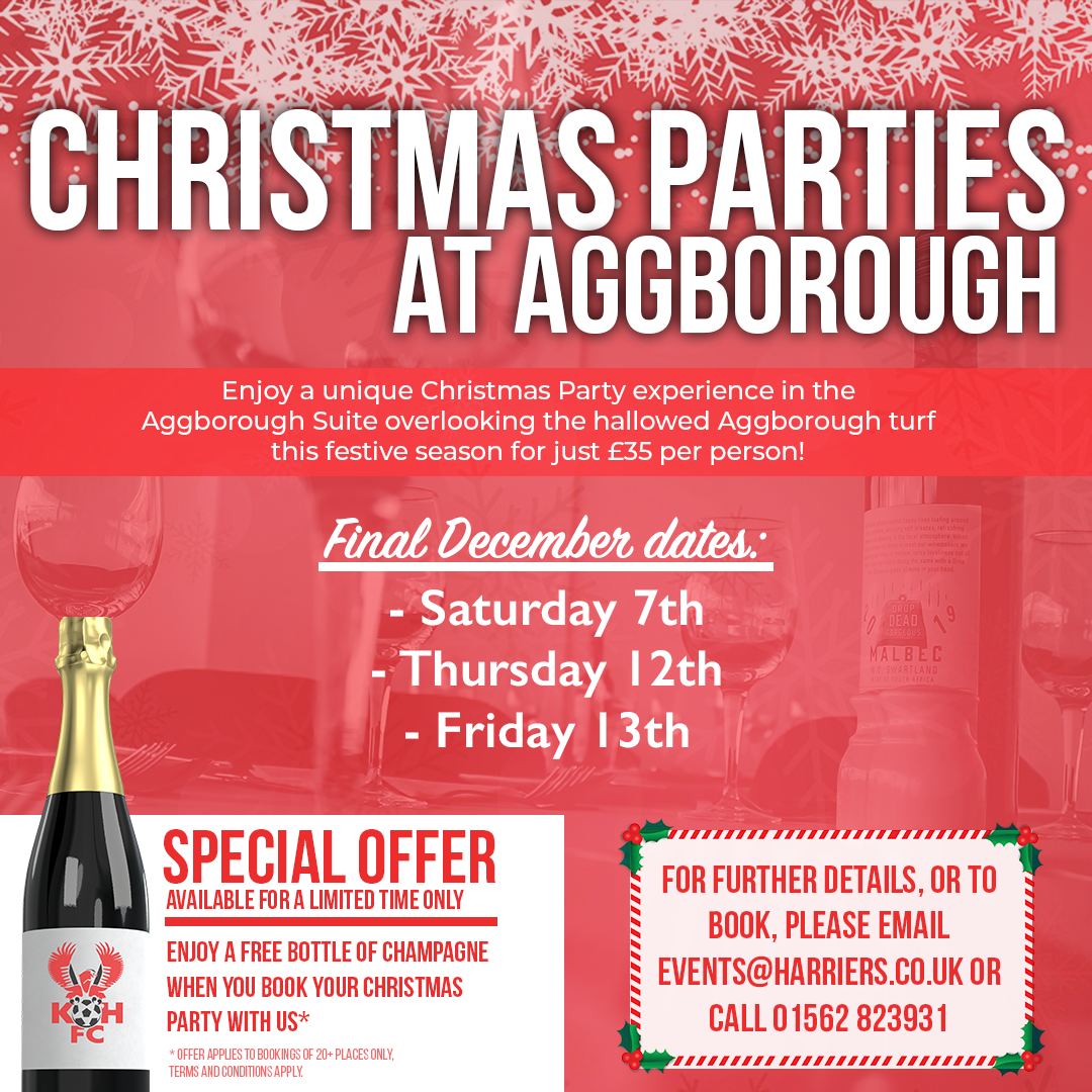 For further details, or to book your Christmas party with us please e-mail events@harriers.co.uk, or call 01562 823931.