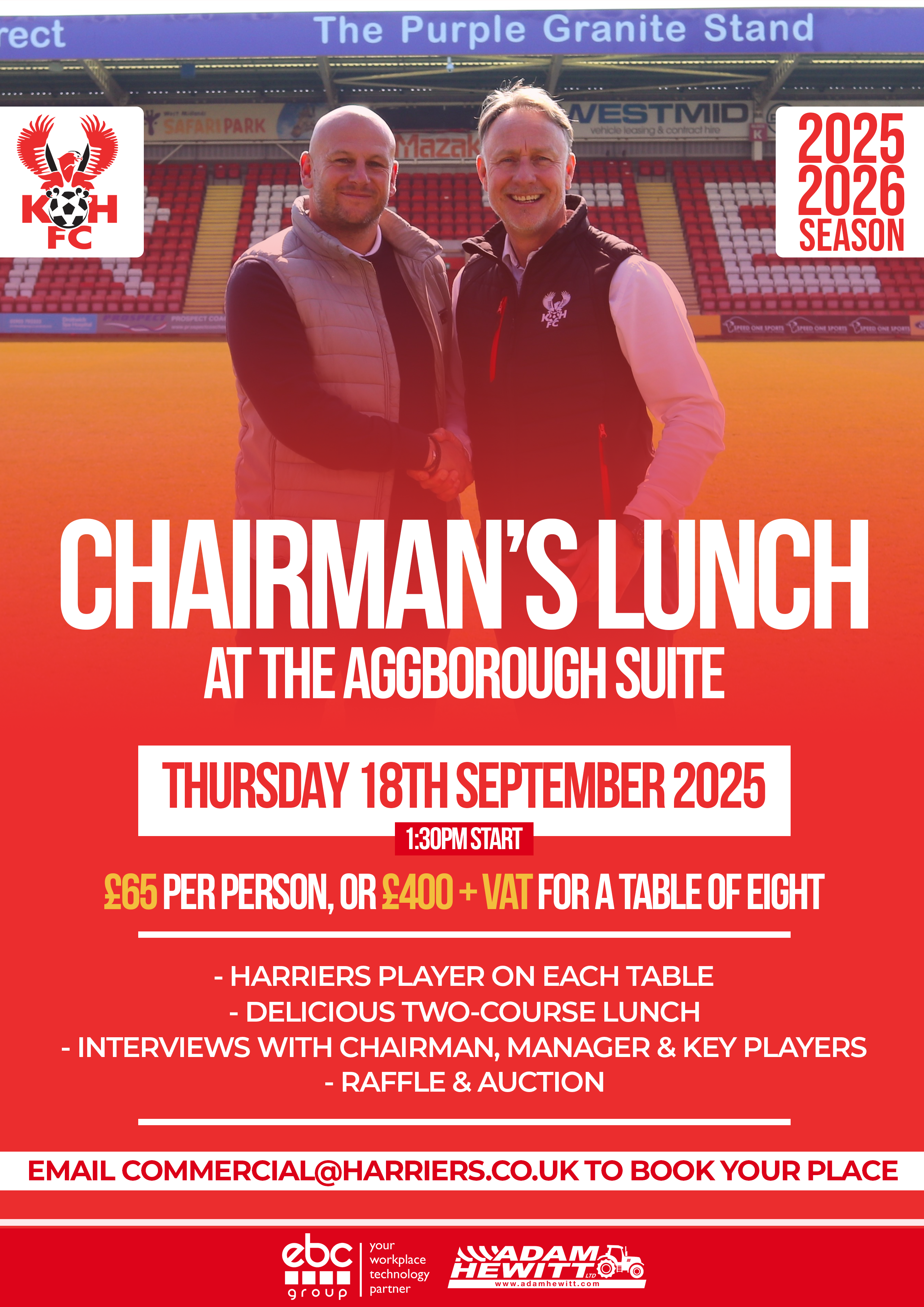 Our annual Chairman’s Lunch is set to take place on Thursday 18th September, starting at 1:30pm, and is a popular event that always sees a packed out Aggborough Suite.