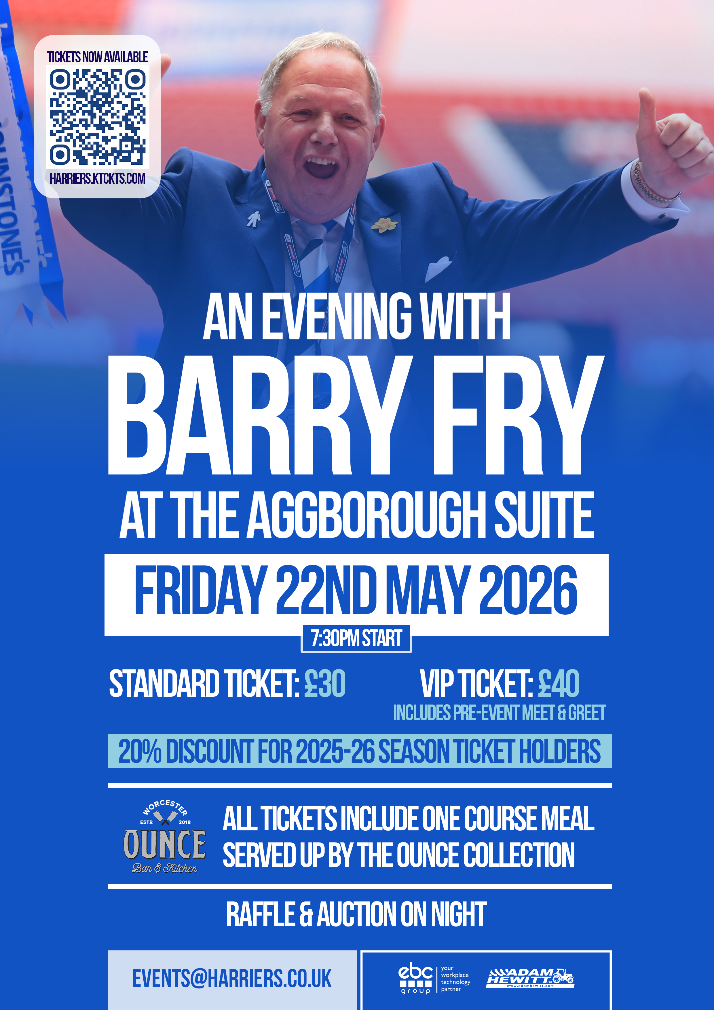 WE are delighted to announce that Barry Fry will host our latest ‘An Evening With…’ event in the Aggborough Suite on Friday 22nd May.
